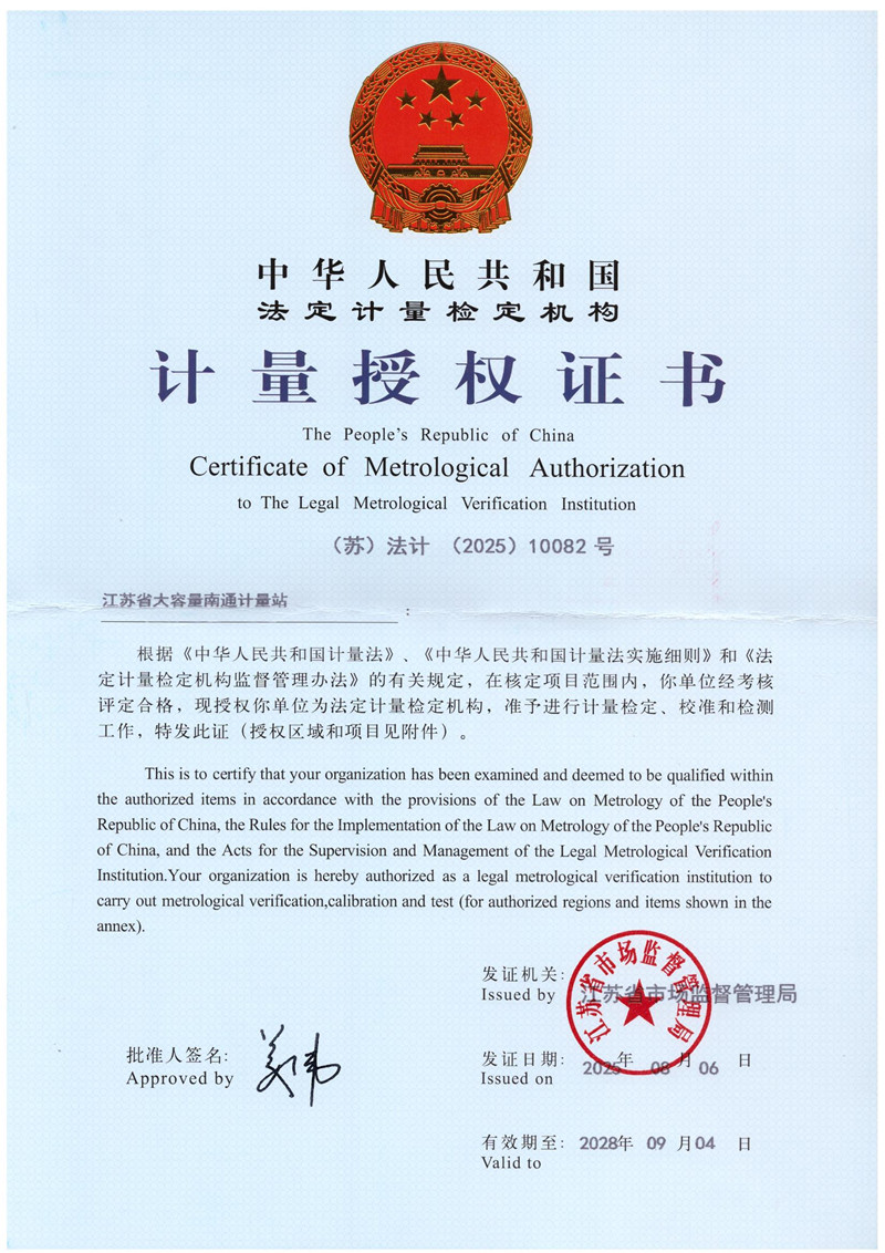 江苏省大容量南通计量站授权证书
